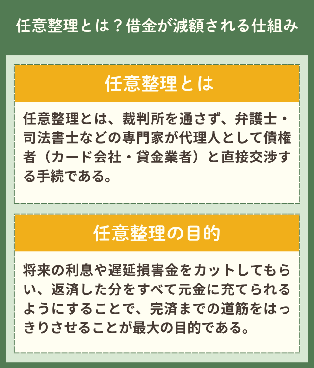 任意整理とは、裁判所を通さず、弁護士・司法書士などの専門家が代理人として債権者(カード会社・貸金業者)と直接交渉する手続である。