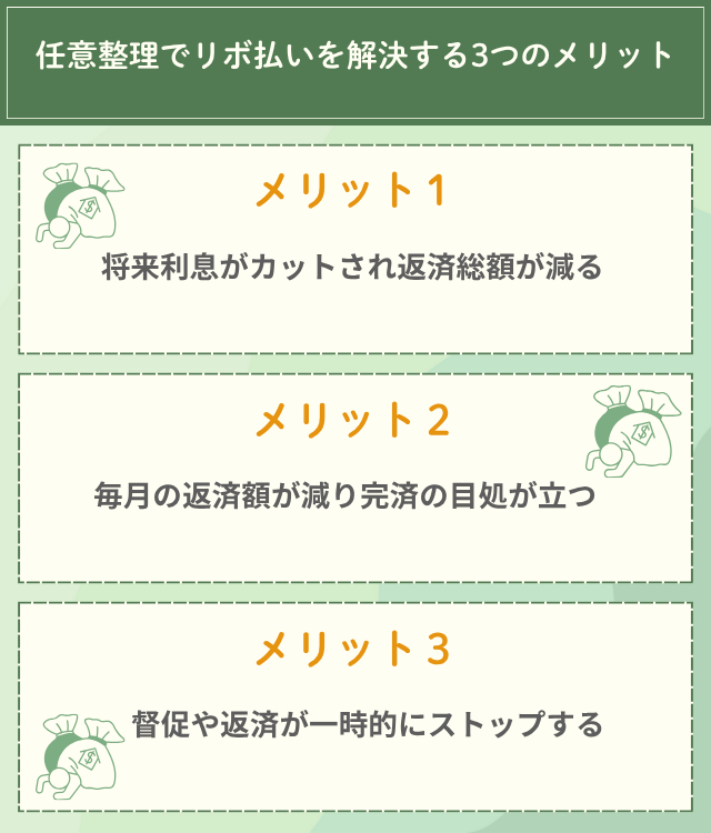 任意整理には、返済の負担を大きく減らせる具体的なメリットがあります。ここでは、リボ払いを任意整理で解決する主な3つのメリットを見ていきましょう。