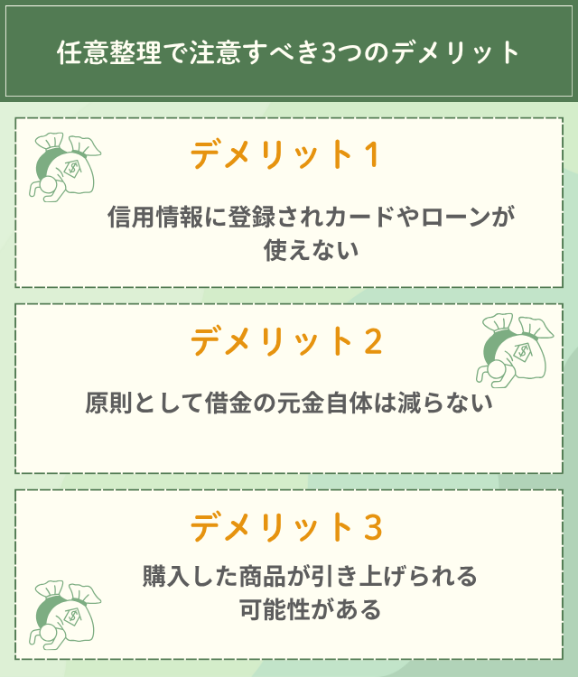 メリットの多い任意整理ですが、実行する前に知っておくべき注意点(デメリット)もあります。ここでは主な3つのリスクと、その対処策をセットで解説します。