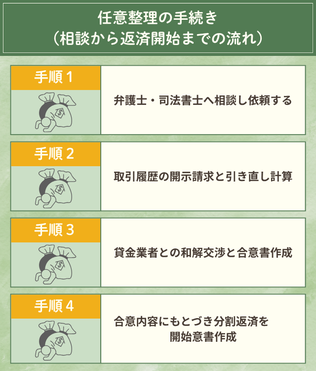 リボ払いの返済が困難になった場合の解決策の一つが「任意整理」です。ここでは、任意整理がどのような手続きで、どうやって借金の負担を減らすのか、その仕組みを解説します。