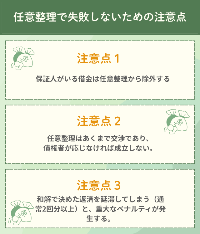 任意整理を成功させ、確実に完済までたどり着くためには、いくつか押さえておくべき注意点があります。