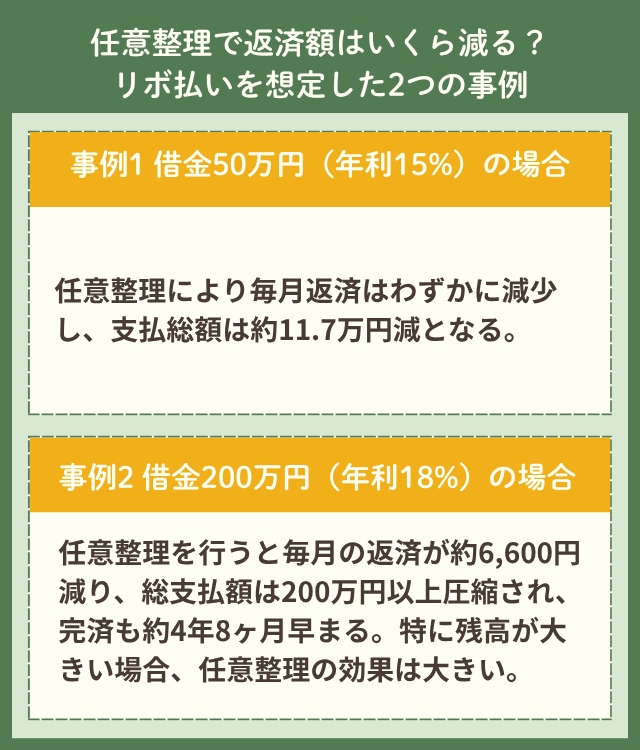 任意整理によって、実際の返済額がどのように変わるのか。リボ払いを想定した2つの事例で、ビフォー(リボ継続)とアフター(任意整理)を比較してみましょう。 ※将来利息が0円、返済回数が36回または60回で和解できた場合の試算です。実際は条件により異なります。