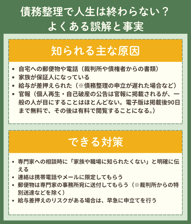 債務整理をためらう大きな理由に、「人生が終わる」かのような漠然とした不安があります。ここでは、よくある誤解(家族バレ、職場バレ、信用情報、戸籍など)を取り上げ、事実と対策を簡潔に解説します。