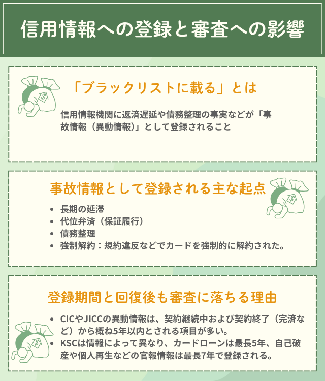 俗に「ブラックリストに載る」と呼ばれる状態は、信用情報機関に返済遅延や債務整理の事実などが「事故情報(異動情報)」として登録されることを指す。